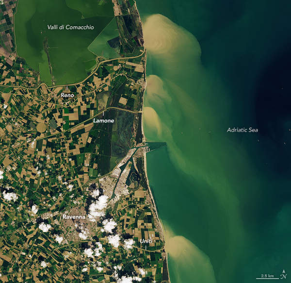 A Landsat–8 (OLI) 2023. május 4-én készített felvétele az Adriai tenger partvidékének arról a szakaszáról, ahol a megáradt és nagy mennyiségű hordalékot szállító folyók a tengerbe ömlenek. (Kép: NASA Earth Observatory, Lauren Dauphin; Landsat adatok: U.S. Geological Survey)