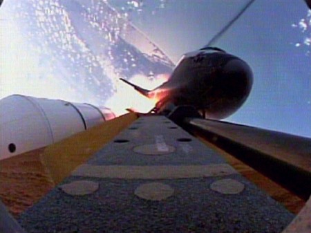 A módosítások utolsó csoportját a képalkotó rendszerek jelentik. A vizsgálóbizottság jelentése szerint a Kennedy Űrközpontban nem volt megfelelő eljárás az űrrepülőgépek orrát és szárnyaik belépő éleit borító RCC-panelek vizsgálatára, ezáltal az évek során a szemmel nem látható repedések és egyéb sérülések jelentősen meggyengíthették őket. Így hát a bizottság azt ajánlotta a NASA-nak, hogy dolgozzon ki egy olyan, roncsolásmentes eljárást, amellyel az RCC-panelek szemmel láthatatlan sérülései felismerhetők. Ez az eljárás a flash termográfia lett. Lényege, hogy nagy intenzitású lézersugárral felmelegítik az RCC-elemek régióit, és egy infravörös tartományban üzemelő kamerával megfigyelik a lehűléskor keletkezett képet. A vizsgálat során a bizottságnak viszonylag nehéz volt bizonyítania, hogy a lehulló hab okozta a Columbia szárnyán a később végzetesnek bizonyult sérülést, mivel nem állt rendelkezésre jó minőségű videofelvétel a startról. Ha lett volna ilyen, akkor nagy valószínűséggel még a repülés idején kiderülhetett volna, és nagyobb nyilvánosságot kapott volna a probléma… Erre az esetre a jövőben az űrrepülőgépek startjait minden eddiginél több nézőpontból és minden eddiginél jobb minőségben rögzítik majd, mind elektronikusan, mind hagyományosan (filmre), normál és nagy sebességű kamerákkal is. A NASA a közelmúltban tíz, az alábbihoz hasonló kamerakocsit vásárolt, melyeken 500-3800 mm-es fókusztávolság-tartományokban különféle objektívvel szerelt kamerák találhatók (összehasonlításképpen, egy normál 35 mm-es kisfilmes fényképezőgép általános optikája 28-90 mm-es fókusztávolságú, vagyis a 28 mm-es állását viszonyítási alapul véve, a NASA kamerakocsijainak 3800 mm-es objektíve 135-szörös zoomnak felel meg). A minél több nézetből való rögzítéshez az is hozzá tartozik, hogy az egyszer (2002 októberében) már bizonyított, külső hajtóanyagtartályra szerelt kamera (RocketCam) ezentúl minden repülésen jelen lesz. 2002-ben a RocketCam ezt a képet adta az Atlantis űrrepülőgépről: Mint látható, a képen nem látszik az Atlantis bal szárnya (a kép jobb oldalán), mivel a folyékony oxigén csővezetéke eltakarja. Ennek kiküszöbölésére a felújított repüléseken a kamerát a cső kiindulási pontjára, a cső „tetejére” helyezik majd. Ily módon tehát a cső a kamera által adott képen alul lesz, és az űrrepülőgép mindkét szárnya láthatóvá válik. A kamerakocsikon és a külső tartályra szerelt kamerán kívül több fix telepítésű földi kamera, valamint hajókra és repülőgépekre telepített kamerák fogják figyelni az emelkedő űrrepülőgépeket. Még egy módja van annak, hogy az esetlegesen lehulló szigetelőhab-darabokról bizonyítékokat lehessen szerezni. Amikor az űrrepülőgépről leválasztják a külső tartályt, akkor az űrrepülőgép nagy csatlakozócsövei mellől egy beépített kamerával fogják fényképezni a tartályt. A leválasztás után 1,5 másodpercenként 24 fénykép készül majd, melyet a legénység tölt le a kamera flash kártyájáról a fedélzeten lévő egyik laptopra, és a telemetriával továbbítják az irányítóközpontba. Az alábbi fotón egy ilyen beépített kamerát illesztenek próbaképpen az Atlantis csatlakozói mellé. Korábban néhány repülésen erre a helyre már beépítettek hagyományos filmes kamerát, azonban azok a kamerák nem repültek rendszeresen, és a fényképeket is csak a sikeres leszállás után lehetett kiértékelni. A Discovery mostani repülésén is lesz ilyen filmes kamera is. A sorozatban bemutatott módosításokon kívül egy sor kisebb módosítást is bevezettek – ezek csak a legjelentősebbek. A baleseset vizsgáló bizottság jelentésében azonban nem csak műszaki okokat határoztak meg a baleset okaiként. A NASA szervezetét éppúgy felelőssé tették, mint az aláhulló, és a végzetes lyukat ütő szigetelőhabot. A hírek szerint a NASA jó úton halad, és megtette az első lépéseket az átalakulás felé. Aggasztó hírek is érkeznek ugyan, de reméljük, hogy mind a szervezeti, mind a műszaki változtatások elérik céljukat, és az űrrepülőgép-program hátralévő 20-25 repülése problémamentesen zajlik majd… A Discovery indítását az STS-114 jelű küldetésre július 13-án, közép-európai idő szerint 21:51-re tervezi a NASA. Fotók: NASA Kapcsolódó cikkek: