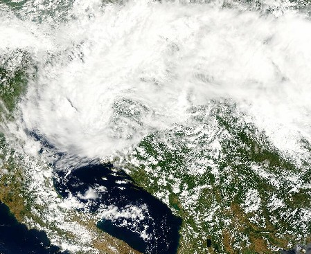 Képünkön egész térségünk, Velencétől Erdély keleti pereméig felhővel borított, a ciklontól délre előtűnik az Adria, Olaszország, délnyugati oldalán a Tirrén-tengerrel, és a Balkán. A ciklon felhőzete azt mutatja, hogy a kép készítésének pillanatában a felhőörvény középpontja valahol Bosznia északi része felett volt. Az Adria déli része felett egy borzas, fehér „pamacs” egy helyi zivatarcellát jelez.