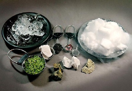 A fenti, félig-meddig tréfás képen a Tempel-1 üstökös „hozzávalói” láthatók, amelyeket a NASA Spitzer infravörös űrtávcsövének színképelemzőjével azonosítottak. Ezek a vízjég és a szén-dioxidból álló szárazjég (balra ill. jobbra hátul, a tálakon), valamint olivin, smektit agyag, policiklikus aromás szénhidrogének, spinel, fémes vas, illetve enstatit (szilikát), dolomit (karbonát) és makrazit (vas-szulfid).