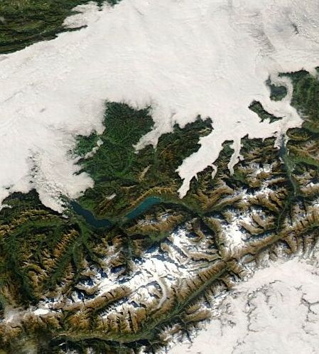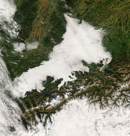 A múlt héten ilyen helyzet alakult ki az Alpok északi oldalán, a Zürich környéki völgyekben is. A kép közepén egy alacsonyszintű, réteg- (sztrátusz-) felhőkből álló zóna látható, északnyugati oldalán a barnás Rajna-árokkal, tőle keletre a Fekete-erdővel. Ez utóbbinak a gerince meg is fogja a magasabb térszínen levő ködöt. A kép déli részén az Alpok főgerincétől délre összetorlódott felhőzet látható. A völgyekbe (és helyenként a tavak fölé), déli irányban benyúló ködöt a kép közepén láthatjuk: helyenként egy-egy csúcs szigetként emelkedik ki a ködtengerből.