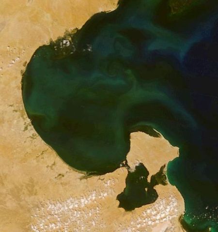 Bár sivatagos-felsivatagos szárazföld sárgás színei ilyenkor nyáron még a zöld szigetként híres Dzserbát is uralják, a tengerfelszín korántsem ilyen egyhangú.