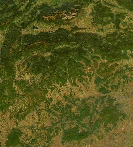 A kép északi végének közepénél a Tátra tömbjét láthatjuk: a havasi rétek és a sziklás gerincek világos foltként jelennek meg sötétzöld fenyvesek gyűrűjében. A hegyvidék déli, és különösen délkeleti előterében a szélvihar által két éve kidöntött erdők helyén látszik barnás folt. Délebbre az Alacsony-Tátra vonulata látszik. A kép alján, nyugatról keletre haladva a Börzsöny, a Mátra és a Bükk erdőségeit figyelhetjük meg.