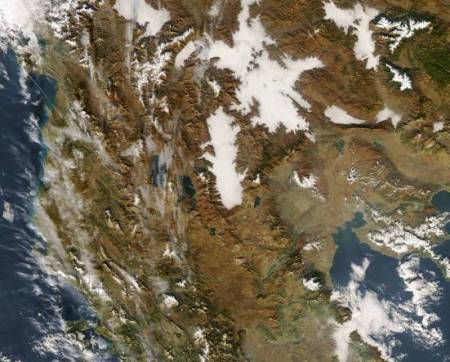 Így volt ez a Balkánon is. Képünk nyugati (bal) oldalán az Adriai- és a Jón-tenger, délkeleten az Égei-tenger látszik, utóbbi nyugati partján a havas Olimposszal. A kép délnyugati sarkában van Korfu szigete, az északkeletiben pedig Bulgária legmagasabb hegyvidéke, a Rila. A kép közepén láthatók Macedónia medencéinek óriás ködmezői, nyugati oldalukon az Ohridi- és Preszpa-tavakkal, északi végükön a 2700 méter magas, havas Sar-planinával. Ennek északi határán már Koszovó van (a kép felső szélén), amelyet szintén köd borít.