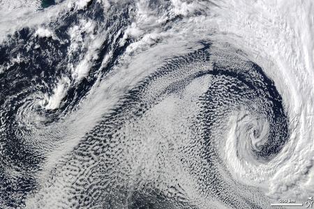 A tájolás ezúttal nem a megszokott: az északi irány a kép bal oldala felé mutat. A kiterjedt, S-re emlékeztető mintát formázó felhőzet két, egymással kapcsolatban levő ciklonhoz tartozik. A sarkvidéki ciklonok az óceán fölött, alacsony légnyomás mellett alakulnak ki, és erős szelet, kiadós hóesést hoznak. Az Atlanti-óceán déli részének környezetében hamarosan beköszönt a tél.