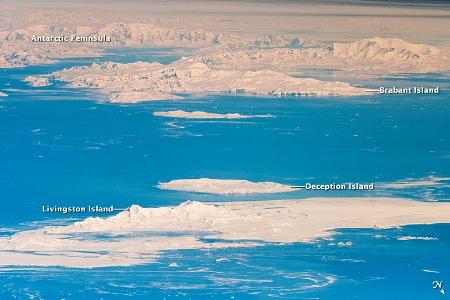 Ami a déli-sarkvidéki kontinensből az ISS-ről látható, az így is csak az Antarktiszi-félsziget csúcsa, amely a földrész legészakibb, Dél-Amerika felé eső „nyúlványa”. A félsziget egy része a déli sarkkörön innen található, 64°-os déli szélesség környékén. Az Antarktiszi-félsziget legészakibb vidéke a Graham-föld, amelynek egy kis részlete a kép bal felső negyedében látható. Az űrhajós-fotográfia előterében, észak-északnyugati irányban a Déli-Shetland-szigetek két tagja – elöl a nagyobb a Livingston-, mögötte a kisebb Csalódás-sziget (Deception) – fehér tömbje vehető ki.