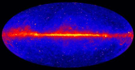 Az egész égbolt képe 1 GeV-nál nagyobb energiákon, a LAT műszer 5 év során gyűjtött adataiból összeállítva. A világosabb színek fényesebb gamma- forrásokat jelölnek. (Kép: NASA / DOE / Fermi LAT Collaboration)