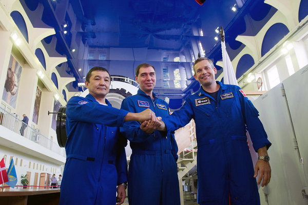 A Szojuz TMA–18M három űrhajósa augusztus elején sikeresen letette az utolsó vizsgákat is, így készen állnak a szeptember 2-ára kitűzött űrrepülésükre. Balról jobbra: Ajdin Aimbetov, Szergej Volkov és Andreas Mogensen. (Kép: Roszkoszmosz)
