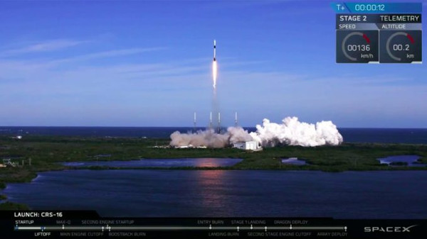A Dragon teherűrhajó CRS-16 jelzésű (vagyis tizenhatodik menetrend szerinti) példánya a floridai Cape Canaveral 40-es startállásából indult december 5-én, magyar idő szerint 19:16-kor. A Falcon-9 hordozórakéta elhasznált első fokozata mintegy 8 perccel később landolt volna a közeli szárazföldi leszállóhelyen, de az utóbbi időben rutinműveletnek számító eseményt most egy hiba zavarta meg, ami miatt a fokozat a közelben a tenger vizébe ereszkedett le. A mai start a SpaceX számára már a huszadik volt az idén, az előző Falcon-9 indítás csak két nappal ezelőtt történt, Kaliforniából.
