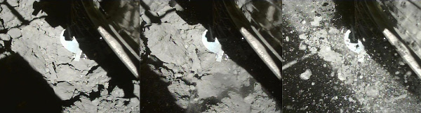A tökéletesen kivitelezett, automatikus üzemmódban végrehajtott manőver alkalmával a szonda óvatosan, a végén mindössze 10 cm/s-es sebességgel megközelítette a Ryugu kisbolygót. Eközben lézeres távolságmérőt használt, és azt a fényes céltárgyat figyelte, amely a korábbi becsapódási helyet jelezte számára. A kibocsátott lövedék által felvert kisbolygóanyag a mintavevő kürtőbe jutott, majd másodpercekkel később meg is kezdődött az űreszköz távolodása az égitesttől.