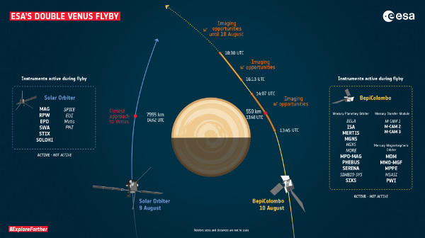 A Solar Orbiter augusztus 9-én világidőben (UT) 4:42-kor éri el mostani legnagyobb közelségét, 7995 km-t. A hintamanőver célja, hogy a szonda Nap körüli pályájának hajlásszögét megemelje az ekliptikai síkhoz képest. Így a Solar Orbiter egyre inkább „felülről” is képes lesz központi csillagunk megfigyelésére. Az európai és japán együttműködésben készült BepiColombo augusztus 10-én 13:48 UT-kor még kisebb távolságban, mindössze 550 km-re repül el a Vénusz felszíne fölött. A szonda végső célja a legbelső bolygó, a Merkúr körüli pályára állás, amihez a Föld, a Vénusz és maga a Merkúr körüli gravitációs lendítő manőverek sorozatát illesztették a repülési programba.