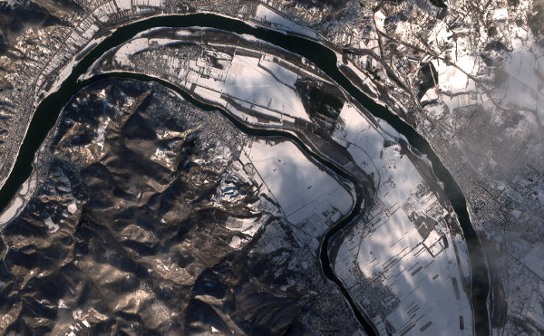 Az európai Sentinel-2A műhold felvételein mutatjuk be a Dunakanyart és Budapest környékét a januári jégzajlás idején.