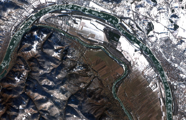 A Dunakanyar, a Szentendrei-sziget északi részével, január 8-án. (Kép: Copernicus Sentinel adatok 2017 / Geo-Sentinel) – nagy felbontásban itt letölthető