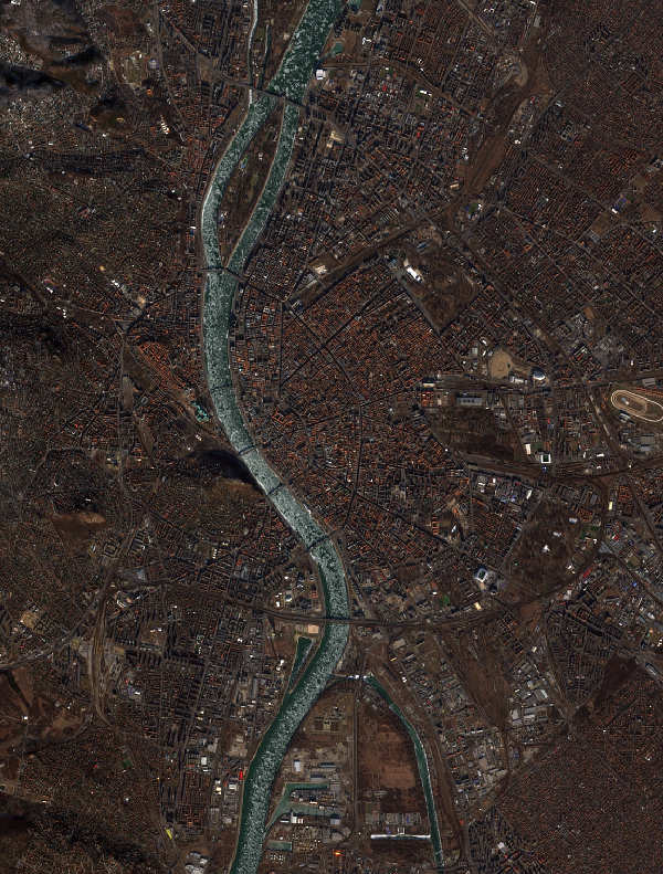 Az elmúlt napokban-hetekben a zajló jégről rengeteg látványos fénykép és drónról készített videó látott napvilágot. A még a madártávlaton is túlról, a Föld körül majdnem 800 km magasságból készült felvétel részleteit mutatjuk most be. A helyszíni fényképekkel és videókkal ellentétben a műholddal a lokális helyett teljes országos lefedettségű képet alkothatunk a folyami jéghelyzetről. A képeket az európai Copernicus földmegfigyelési program optikai távérzékelő műholdja, a Sentinel-2A adataiból a Sentinel blog készítette. Január 8-án, magyar idő szerint 10:53-kor, miközben a Sentinel-2A Magyarország felett repült el, szerencsére derült volt az idő, így az űrből is jól látszott a több-kevesebb hóval borított felszín, valamint a Dunán úszó jégtáblák. Az alábbi képrészleteken a különböző hullámsávokban felvett adatok valóshoz közeli színű kombinációját láthatják.