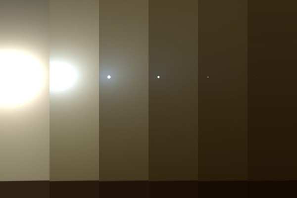 Szimulált képeken követhetjük, ahogyan az Opportunity állomáshelyén a Nap látszana a légkör átlátszóságára jellemző mérőszám, az optikai mélység 1, 3, 5, 7, 9 és 11 értéke mellett. Az optikai mélység (τ) az eredeti és a megfigyelőig eljutó intenzitás aránya természetes alapú logaritmusának –1-szerese. (Kép: NASA / JPL-Caltech / TAMU)