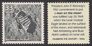 Az első amerikai bélyegkiadás egy 10 centes címlet volt, feliratával az első emberre utalva a Holdon. 1969. szeptember 9-én került forgalomba, nem egészen két hónappal azután, hogy Armstong, Aldrin és harmadik társuk, Michael Collins sikeresen visszatért a Földre. A bélyeg nyomómintája egyébként eljutott a Holdig és vissza az Apollo-11 fedélzetén. A bélyeg tervezője Paul Calle volt.
