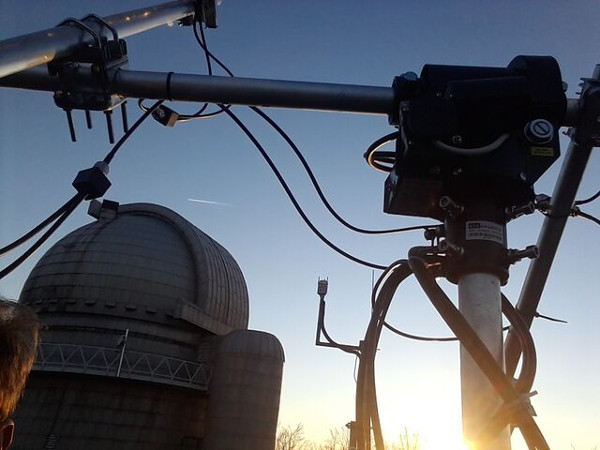 A piszkéstetői követőállomás antennája, a háttérben Magyarország legnagyobb, 1 m-es tükörátmérőjű csillagászati távcsövének kupolája. (Kép: CSFK)