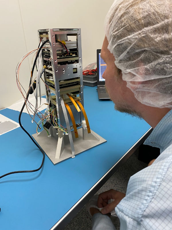 Hogyan is tudnánk megtoldani a kábelezést?... Pál András (CSFK projektvezető) a VZLÚSat-2 készítése közben. (Kép: CSFK)