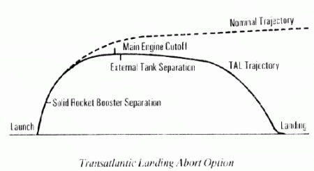 Ha a felszállásnak abban a szakaszában következik be hiba, amikor már nem lehetséges a starthelyre visszatérni (RTLS), de még nem hajtható végre a Föld egyszeri megkerülése (AOA, lásd alább), az űrrepülőgép leszállhat Európában vagy Észak-Afrikában is. Az űrrepülőgép ballisztikus pályán repül át az Atlanti-Óceán felett. A kiválasztott leszállóhelynek rendelkeznie kell az amerikai védelmi minisztérium jóváhagyásával. Jelenleg a lehetséges leszállóhelyek Moron (Spanyolországban), Dakar (Szenegálban) és Ben Guerir (Marokkóban). Ezek közül, még a start előtt, mindig a repülés tervezett pályájához legközelebb esőt jelölik ki, szükség esetére. Természetesen, csakúgy, mint az űrrepülőgép normál leszállásakor a fő leszállóhelyeken (Kennedy Űrközpont és Edwards Légitámaszpont), a kijelölt vészleszállóhelyen is megfelelőnek kell lennie az időjárási viszonyoknak. Többször elõfordult már, hogy a visszaszámlálást azért állították le a start előtt, mert rossz volt az időjárás a kijelölt TAL-helyen.