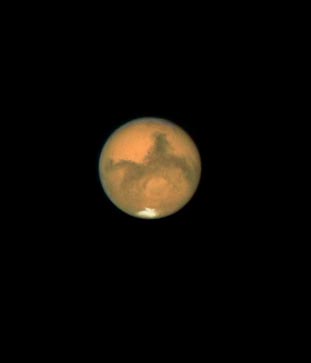 Mindkét képen látható a déli pólussapka, mely vízjég és széndioxidjég (szárazjég) keverékéből áll. Űrszondás felvételeken jól látszik, hogy a déli félteke nyara során a légkörbe visszatérő széndioxid milyen változatos mintázatot farag a hósapkára: az IKONOS felvételen szintén jól látható, hogy a hósapka milyen recézett szélű.