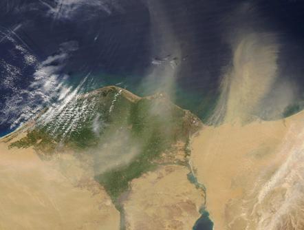 A sivatagból felkapott sárga homok utazik a szelek szárnyán az AQUA műhold alábbi valódi színes MODIS-felvételén. A március 31-én készült felvételen jól látszik a Nílus deltája és a Szuezi-csatorna is.