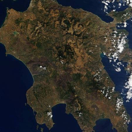 Képünkön a Balkán déli vége, a Peloponnészosz-félsziget közepe látható, nyugaton a Jón-tengerrel, északkeleten a Korinthoszi-földszorossal. Figyeljük meg a színeket: elsőre félrevezető, hogy a kép közepén nagy, sötét, majdnem fekete foltok látszanak, ezek mediterrán fenyvesek. A tüzek nyomán ettől délre és a nyugati parton kell keresnünk, barnás foltok formájában. Kiterjedésük impozáns: 20-30 kilométer nagyságú erdőrészek váltak itt a lángok martalékává.