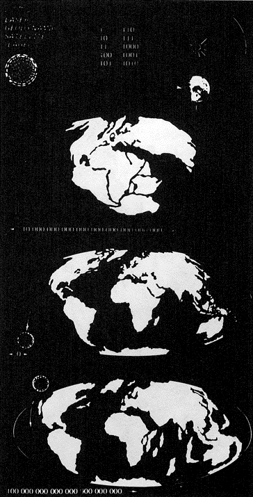 A LAGEOS-1-re szerelt plakett ábrája. A kontinensek helyzetét mutató három rajz közül a középső, a 0 feliratú a jelenlegi állapotot szemlélteti. A rajzok alatt levő számok az időre utalnak, a műhold által a Föld körül megtett fordulatok egységében kifejezve – a felbocsátás előtt (fent) és után (lent). (Kép: NASA)