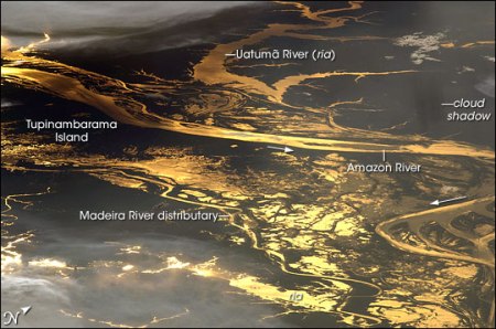 A képen az Amazonas mintegy 150 km-es, kanyargó szakasza látható. A terület az Atlanti-óceántól 1000 km-re, a kontinens belseje felé található, Brazíliában. A fotóra rajzolt nyilak a folyásirányt mutatják. A folyam számos mellékfolyójának egyike, az Uatuma (fent, középen) északról torkollik az Amazonasba. A Madeira folyó egyik mellékága balról „folyik be” a képre.