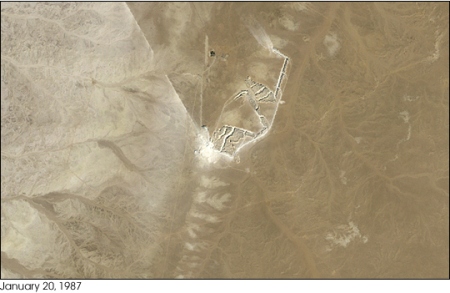 A fenti, valódi színeket mutató műholdképeket az amerikai Landsat-5 (1987. január 20., fent) és Landsat-7 (2000. január 16., lent) készítette. Jól látható, hogy az eltelt bő évtized alatt a bányászat kiterjedt, elsősorban déli irányban. Mindkét felvételen kivehető egy északnyugati irányba induló egyenes vonal. Ez az a futószalag, amin a kitermelt anyagot szállítják. Kapacitása óránként 2000 tonna. Ez jelenleg a világ leghosszabb ilyen rendszere, egészen El-Ajúnig ér. 2000-ben a külszíni fejtés 1225 hektárt érintett. 2001-es adatok szerint az éves termelés másfél millió tonna foszfát volt.