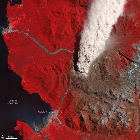 A Chaitén-vulkán tavaly májusban, több mint 9 ezer (!) évnyi nyugalom után tört ki ismét. (Erről annak idején mi is bemutattunk egy űrfelvételt - ld. lent.) Az azóta eltelt hónapok során a tűzhányó aktív maradt, füstöt és vulkáni hamut eregetve. Ez utóbbi belepte a környék növényzetét, eltorlaszolta a vízfolyásokat. A sáros áradat többször elöntötte a közeli Chaitén városát, amely a felső kép bal alsó részén látható. Érdekes módon a város szabályos szerkezete még így is jól kivehető az űrfelvételen. Az alsó, a vulkánt közelebbről mutató képkivágáson a hegy közvetlen környezete látszik. Az infravörös és látható fény hullámhosszain készült felvételek kombinálásával előállított hamis színezésű képen vörösben látszik a növényzet. A víz sötétkék, a kopár (illetve hamuval vastagon borított) felszín barna. Maga a vulkáni füst fehér színű, elég vastag ahhoz, hogy a műholdas detektor elől teljesen eltakarja az alatta levő felszínt.