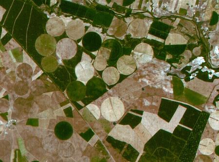 A vidék ipara elsősorban a mezőgazdaságra épül. A Júcar folyó duzzasztásával öntözővizet nyernek és elektromos energiát is termelnek. A felvétel jellegzetességei a kör alakú formák, amelyek a földek öntözési módszeréből következően ilyenek. A középen levő kutakból a forgó öntözőrendszerek kör alakban látják el vízzel a földeket.