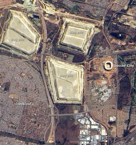 A stadion szinte eltörpül a képen ugyancsak látható három nagy meddőhányó mellett. Ezek a több évtizedes aranybányászat melléktermékeként emelkedtek. Az aranytartalmú kőzeteket még a 19. század végén fedezték fel a vidéken. A meddőhányókban a kitermelt, összetört, aranyat már nem tartalmazó kőzetet halmozták fel. A meddőhányóknak a stadionnal átellenes oldalán Soweto egyik városrésze, Diepkloof házai és utcahálózata tűik fel.