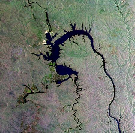 Szibéria délkeleti részén az Angara folyó felduzzasztásával alakították ki a Bratszki-víztározót, amely szinte úgy néz ki az Envisat műhold radarképén, mint egy hüllő.