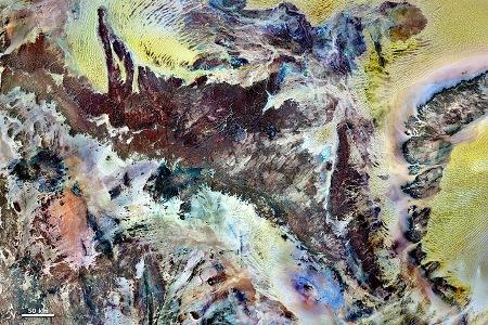 A fenti műholdkép az amerikai Landsat-7 földmegfigyelő mesterséges holddal 2000-ben, több eltérő időpontban végzett mérések alapján készült. A Landsat-7 nem csak a látható fény tartományában, de infravörös hullámhosszakon is érzékeny. A felszín eltérő anyagainak jobb megkülönböztetésére az egyes csatornákon mért fényességi értékekhez különféle színeket rendeltek, így állt elő ez a festői kép. A homok a sárga-sárgásbarna árnyalataiban tűnik fel. A gránitból levő sziklák téglavörösek. A kékes színek sós felszínt jeleznek. A színek kavalkádja alapján nyilvánvaló a vidék, a „szakadékok fennsíkja” geológiai változatossága.