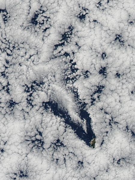 A Chiléhez tartozó, Dél-Amerika csendes-óceáni partjai közelében fekvő két kis sziget látványos nyomokat „rajzol” a felhőzetbe.