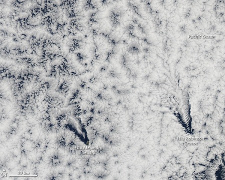 Mind az Alejandro Selkirk-sziget (balra), mind a Robinson Crusoe-sziget (jobbra) vulkanikus eredetű, egy kelet-nyugati irányban húzódó tenger alatti hátságnak az óceán vízfelszíne fölé emelkedő részei. A bemutatott műholdképeken maguk a szigetek alig kivehetők, nem úgy az általuk az egyenletes mintázatú felhőtakaróban okozott zavar. A szigetek akadályt jelentenek a levegő áramlásának, ami a kép készítése idején dél-délkeleti irányú volt. A szigetek a V alakú mintázat csúcsában helyezkednek el.