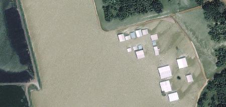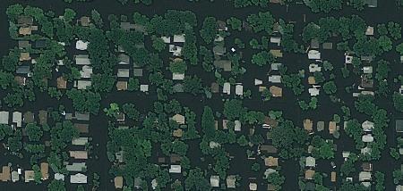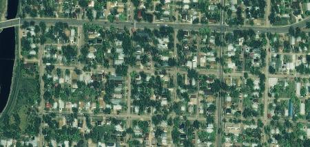 Minot, Észak-Dakota. A felső, eredetileg 1 m-es felszíni felbontású felvételt az IKONOS műholddal készítették 2009. május 30-án. A Souris folyó a településtől nyugatra, a kép bal szélén látható. A szokványos kertvárosi jellegű település házairól készített felvétel akkor válik különösen érdekessé, ha összehasonlítjuk a 2011. június 25-én készülttel. Ez a GeoEye-1 műhold műve, felbontása fél méteres. A folyó 130 éve mért legnagyobb vízállása miatt bekövetkezett árvíz a házakat egészen a tetejükig elöntötte. A háztetőkön kívül csak a magas fák lombja emelkedik ki a vízből. A településen mintegy 4000 otthon vált lakhatatlanná, a lakosság negyedrészét kellett kiköltöztetni.
