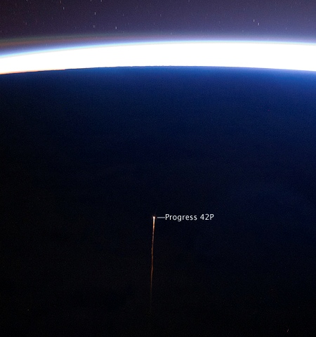 Az alábbi felvétel egy kép abból a sorozatból, amit az ISS 29. számú legénysége készített október 29-én. Ekkor távolodott el és lépett a légkörbe a Progressz M-10M (42P) jelű orosz teherűrhajó. (Az utána következő napon startolt a dokkolóhelyét pár nappal később elfoglaló új Progressz M-13M.) A fotón jól kivehető az a fényes plazmacsóva, amelyet a megsemmisülő Progressz húzott. A teherűrhajó április 29-én kapcsolódott az ISS-hez. Mivel az egyik utána következő példány, az M-12M augusztus végi startja sikertelen volt, a teherűrhajó és vele az utánpótlás nem érte el a Föld körüli pályát, így az űrhajósoknak még több ideje maradt hulladékkal megpakolni ezt az „űrkukát”.
