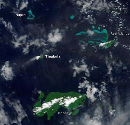 A Salamon-szigetekhez tartozó Tinakula egy apró vulkáni sziget a Csendes-óceán déli részén, az ausztráliai Brisbane-től kb. 2300 km-re északkeletre. Az alább bemutatott képet a NASA EO-1 műholdjának ALI műszerével február 14-én készítették. Jól látható a vulkánból kitörő gáz-, gőz- és hamufelhő. A sziget körül a tenger azért tűnik tejfehérnek, mert a Nap állása és a képet készítő műhold elhelyezkedése miatt a vízfelszínre eső napfény épp a kamera irányába tükröződik. Ettől aztán jól érzékelhetők a képen az óceánfelszín hullámai is.