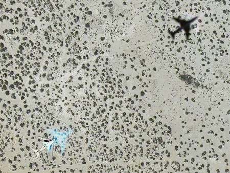 Végül az ígért ráadás. Az amerikai DigitalGlobe cég egyik kereskedelmi földmegfigyelő műholdjának jó pillanatot elkapott felvétele szeptember 20-án készült, amikor a Boeing-747-es, rajta az Endeavour űrrepülőgéppel, útban Kalifornia felé átrepült Új-Mexikó kopár tájai fölött. A felvételen a földre vetülő árnyékuk is jól látszik.