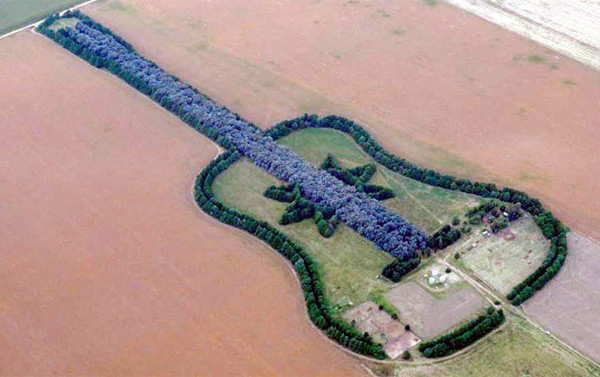 Az erő légi felvételen. A gitár körvonalait ciprusok, a húrokat eukaliptuszok alkotják, így a kompozícióban szerephez jutnak a színek is. (Kép: atlasobscura.com) Kapcsolódó linkek: