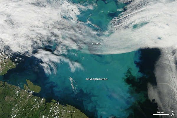 A Skandináviától és Oroszországtól északra fekvő sarkvidéki vizeken a nyári felmelegedés hatására – mint minden évben ilyentájt – szaporodásnak indultak a mikroszkopikus méretű, a növényekhez hasonlóan fotoszintézist végző élőlények. A tengeri fitoplankton „virágzása” általában hálás témája a műholdképeknek. Az alábbi, a valós színeket visszaadó kép különösen szép példány. A NASA Aqua földmegfigyelő holdjának MODIS (Moderate Resolution Imaging Spectroradiometer) műszerével készítették, 2014. július 10-én. A norvég és orosz partoktól északra, a kép közepétől balra zöldes színben örvénylik a fitoplanktonban dús tenger. A kép jobb oldalán viszont inkább szürkésfehérek, tejszerűek az alakzatok. (A jobb felső sarokban felhőzet borítja a tájat.) A fitoplankton a tengeri tápláléklánc egyik alapja, és a fotoszintézis révén a légkör szén-dioxid-tartalmának csökkentésében, az oxigén termelésében is fontos szerepet játszik.