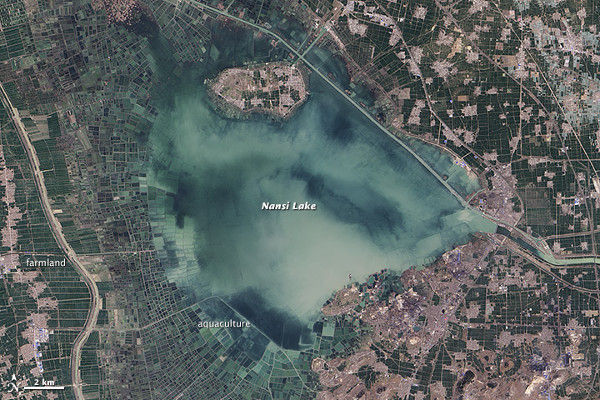 A Landsat–8 felvétele a kínai Nansze-tóról. Jól láthatók a földművelésbe (farmland) és a vízművelésbe (aquaculture) bevont jelentős kiterjedésű területek. (Kép: NASA EO / Jesse Allen / USGS)