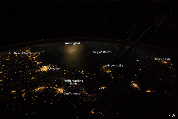 Az itt bemutatott fénykép a Nemzetközi Űrállomás (ISS) fedélzetéről készült. Azon az éjszakán a legnagyobb kiterjedésű fényforrás (középtájt) a Hold, pontosabban a tükörképe volt. A diffúz fény a Mexikói-öböl víztükréről verődött az ISS kamerája irányába.