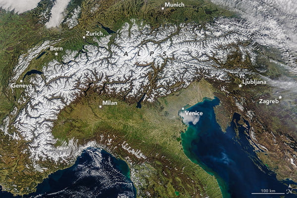 A NASA Terra földmegfigyelő holdján repülő MODIS (Moderate Resolution Imaging Spectroradiometer) műszer alább bemutatott felvételén az Alpok teljes, hóval borított hegylánca látható, a felhőmentes időjárásnak köszönhetően. A kép március 20-án készült. (A tájékozódás segítésére egyes nagyobb városokat külön megjelöltek rajta.)