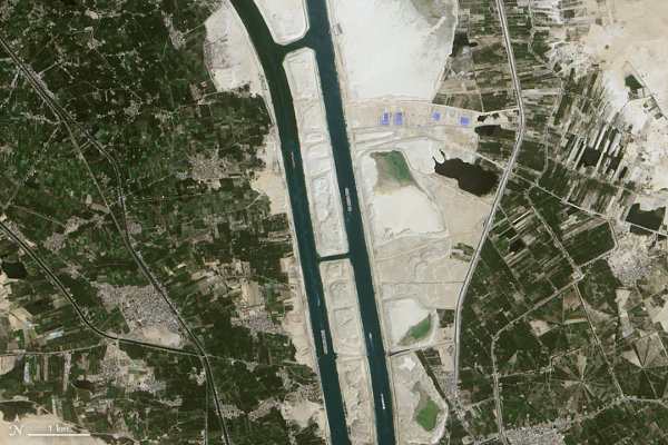 A Szuezi-csatorna észak-déli irányban 193 km hosszan köti el a földközi-tengeri Port Szaíd (Port Said) kikötővárosát a vörös-tengeri Szuezzel (Port Suez). Port Szaídtól délre 76 km-re fekszik a csatorna mentén Iszmáilija (Ismailia) városa, amely a műholdképek közepén látható. Lejjebb délre, a 95. km után következik a Nagy-keserű-tó (a képek alján épp hogy látszik egy részlete). Ez az egyik olyan hely a csatorna mentén, ahol a víz kiszélesedik, a hajók megpihenhetnek. Itt várják be, amíg elhalad a szembe jövő forgalom, hogy aztán a másik irányba haladó hajók birtokba vehessék az „egysávos” csatornát. Épp ezt a várakozási időt csökkenti le az új szakasz. Ahogy a második, idén áprilisi műholdkép kinagyított részletén is látszik a hajók farvizének elhelyezkedéséből, a jobb oldali (keleti) új ágban felfelé (északi irányba), a bal oldaliban lefelé haladnak a hajók.
