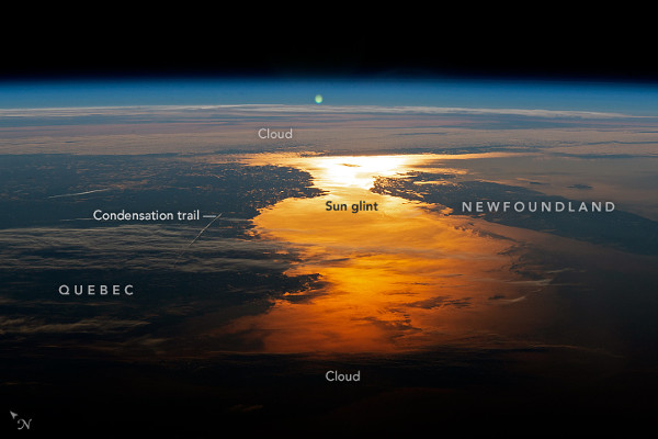 A bemutatott felvételt a Nemzetközi Űrállomás (ISS) 56. állandó személyzetének egyik űrhajósa készítette, 2018. július 5-én. A felvétel készítésekor az ISS az Egyesült Államok Massachusetts állama fölött repült, ettől a helytől mintegy 1700 kilométerrel északkeletre csillan meg a napfény a tenger vizén. Bár a kép jelentős részét felhő takarja, a szárazföld egy része felismerhető. Balra a Labrador-félsziget keleti partja látható, jobbra Új-Fundland, pontosabban a sziget nagy északi félszigete (Great Northern Peninsula). A vízfelület a Szent Lőrinc-öböl északkeleti nyúlványa (a Belle-szigeti szoros, Strait of Belle Isle), ahol pedig a legfényesebben csillog a tenger vize, felismerhető a kis, lakatlan Belle-sziget (Belle Isle).