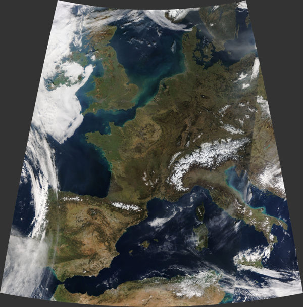 Alább egy nappal és éjszaka készült műholdképet mutatunk be, amelyeket amerikai földmegfigyelő űreszközöknek köszönhetünk. A február 27-ei nappali kép a NASA Terra műholdja MODIS (Moderate Resolution Imaging Spectroradiometer) műszerének adataiból készült. A jellemzően szántőföldi művelés alatt álló, kevés erdővel borított területek így tél végén inkább barnás színben mutatkoznak, az erdőségek pedig sötétzöldek. Az atlanti partvidéken – Franciaországban, Belgiumban és Hollandiában, valamint a Brit-szigeteken – a viszonylag enyhébb és csapadékos éghajlat miatt a növényzet télen is zöldell. Hó leginkább csak az Alpok és a Pireneusok magasabb hegycsúcsait borította a szokatlanul meleg február végi héten.