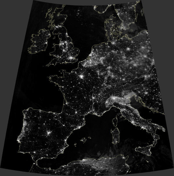 Az éjszakai kép február 26-áról származik, a Suomi NPP műhold VIIRS (Visible Infrared Imaging Radiometer Suite) műszerével készítették. Feltűnőek a nagyvárosok, a néhol a településeket összekötő úthálózat elemei is kivehetők. A legfényesebb éjszakai „látványosságok” Madrid, London, Párizs és Berlin – mind nagy európai fővárosok. Számos helyen, így Közép-Európában és Olaszország északi részén, a Pó völgyében a diffúz és a vártnál fényesebb foltok az alulról megvilágított vékony felhőzet és ködösség miatt látszanak a képen.