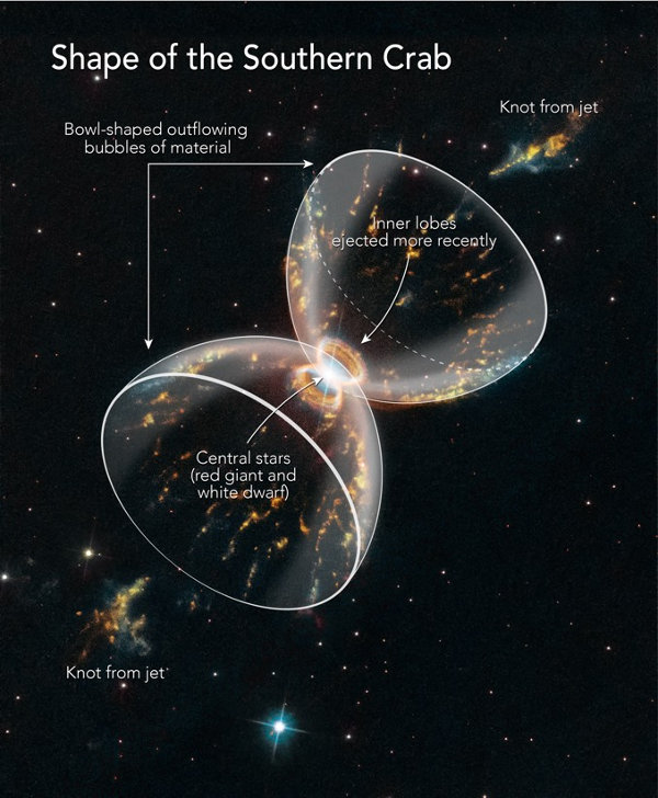A felvétel a déli féltekéről megfigyelhető Déli Rák-ködöt ábrázolja, amely 7000 fényévre van a Földtől, a Kentaur csillagkép irányában található. A köd alakja elsőre egy homokórára emlékeztet, amelyet egy kettőscsillag-rendszer alakított ki. A kettős egyike egy kiégett fehér törpe, míg a másik tagja egy vörös óriás, amelynek külső rétegei épp ledobódnak a csillagról. A fehér törpe gravitációs hatása miatt a vörös óriásról távozó anyag befogódik a kettős köré, kialakítva a jellegzetes homokóra alakot. A rák „lábai” ott keletkeznek, ahol a kiáramló csillaganyag összeütközik a csillagközi gázzal és porral, és az ütközés következtében gerjesztődik az anyag.